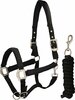 Glinsterend halster van harry's horse, zacht onderlegd bij het kopstuk en de neusriem met neopreen, Verstelbaar aan het neus- en kopstuk, handige clipsluiting, inclusief bijpassend 2-meter halstertouw met muskaton.