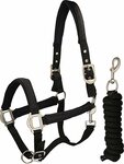 Basis halsterset met zilverkleurige fournituren. Het halster is verstelbaar op kopstuk door middel van een schuifgesp. Lengte halstertouw is 180cm.