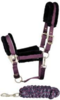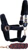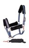 Luxe halsterset met mooi Equestrian Society logo op de neus,super zacht zwart faux fur onder kopstuk, bakstukken en neusriem. Verstelbaar op twee plaatsen, aan beide kanten van het kopstuk en aan de kaak. De gaatjes zijn voorzien van oogjes. Inclusief 2m touw 3-coloured.