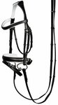 Dit symmetrische hoofdstel is vervaardigd van mooi afgewerkt leder. Het zacht gevoerde kopstuk is teruggesneden bij de oren en ingelegd met een dubbele rij subtiele imitatiediamanten. Het smalle, gebogen frondeel is onderlegd met zacht leder en op dezelfde subtiele manier verfraaid als het kopstuk. De keelriem is aan beide zijden verstelbaar en de bakstukken zijn voorzien van rvs gespjes. Het hoofdstel heeft een brede, gecombineerde aansnoerneusriem (circa 4,5 cm). De neusriem is rond gebombeerd, zacht gevoerd en voorzien van een brede, zacht gevoerde kaakbeschermer. Het hoofdstel is uitgerust met glanzende, zilverkleurige fournituren van roestvrij staal en wordt geleverd inclusief linnen antislipteugels. De teugels hebben hand- en teugelstops en zijn 19 mm breed.