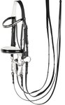 Luxe, half rondgenaaid stang en trens hoofdstel van hoogwaardig leder. Voorzien van lak aansnoerneusriem (4.5cm) met zachte padding, zilverkleurige gespen en blinde sluitingen aan bakstukken. Met hangende frontriem.