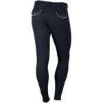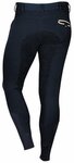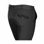 Rijbroek met bandplooi, kontzakken met klep, steekzakken met drukknoop sluiting, gespsluiting en rits, riemlussen en kunstleder kniestukken.