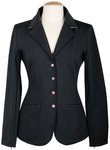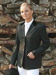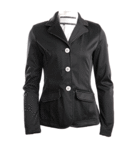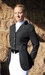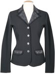 | Omschrijving: Luxe wedstrijdjasje met krijtstreep motief en zilverkleurige bies langs revers/kraag. 3 Luxe glitterknopen op het voorpand, 1 split aan de achterzijde, 2 klepzakjes, chique glanzende voering. Mooie getailleerde pasvorm. |